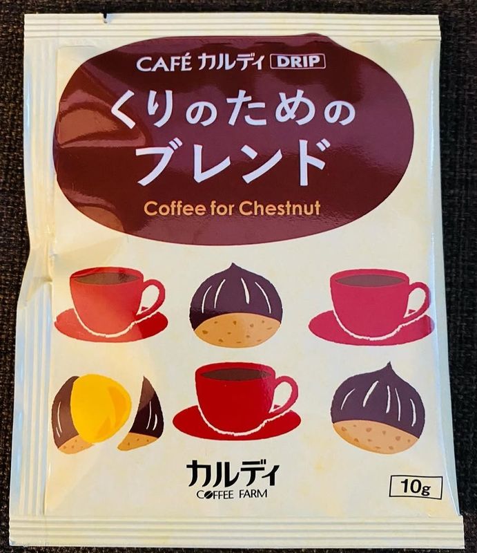 This product is a "Coffee for Chestnuts" sachet, and it's inspired by chestnut flavored sweets. It's available from Kaldi Coffee Farm stores for 170 yen including tax.