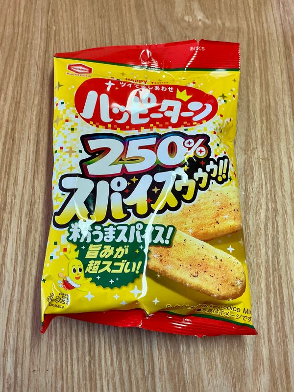 Kameida Seika's Happy Turn rice cracker snacks are coated in a sweet-and-salty powder. The "happy powder" is boosted to 250% for this version. It's sold in convenience stores.