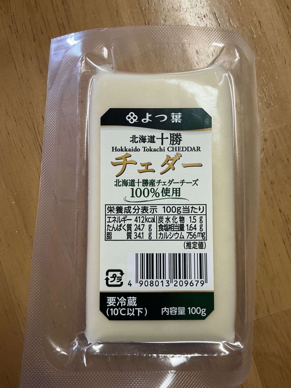 Hokkaido brand Mitsuba produces dairy products. This item is Yotsuba Tokachi cheddar. The 100-gram block of white cheddar is semi-hard and unsliced. I found it at Co-Op in Kasukabe City.