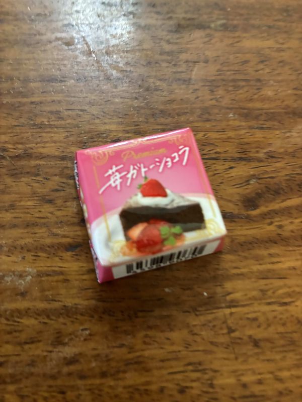 This is one of Tirol’s many small chocolate squares, a newly released seasonal version. The Strawberry Gateux Chocolate, or Ichigo Gato-Shokora (苺ガトーショコラ) is available at a lot of convenience stores currently, and it cost 46 yen including tax.