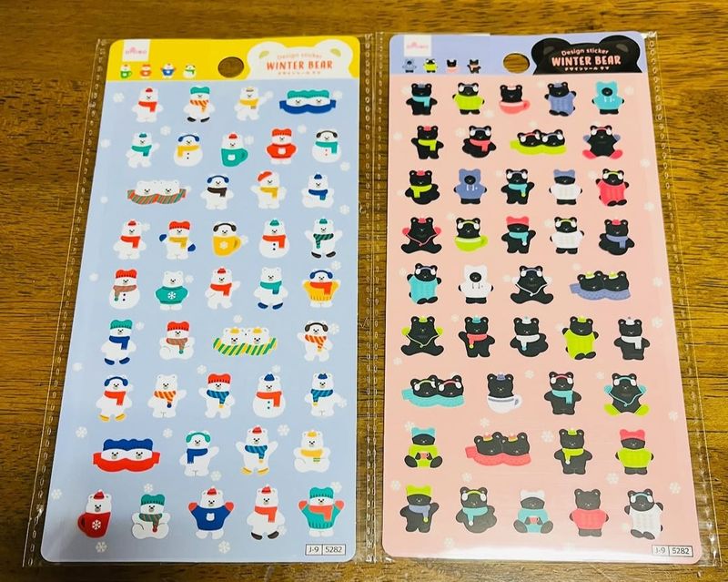 These products are packets of Winter Bear stickers, and I found them at my local Daiso recently. One is a white bear/polar bear style, and the other is a black bear style.