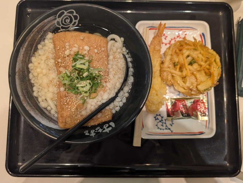 My coworker had introduced me to this chain of Udon shops as "the most affordable decent Udon you will find Japanese school kids and office workers lining up for". Which was quite visible as per the long queue of customers in line during the lunch hours. The concept is simple. You pick your choice of tempura and your bowl of udon which they prepare for you right away and you pay at the counter. Can't get simpler than this. Once you pick up your food tray you can head to the toppings corner to add any garnishes. My recommendation - Fried Tofu Udon (Kitsune) with shrimp and mixed vegetable tempura (Kakiage)