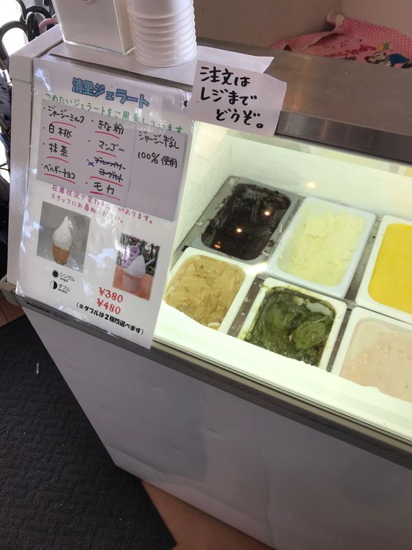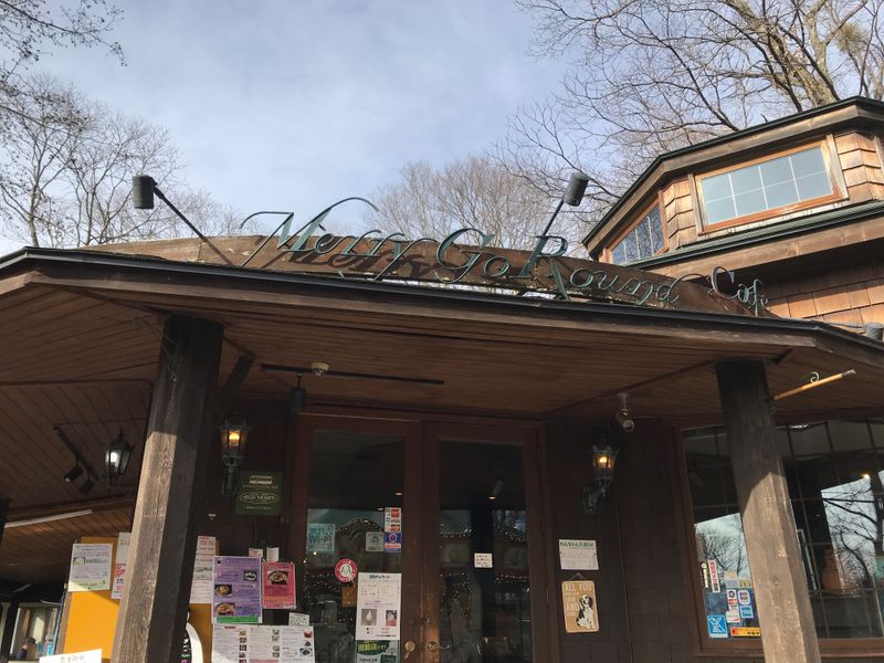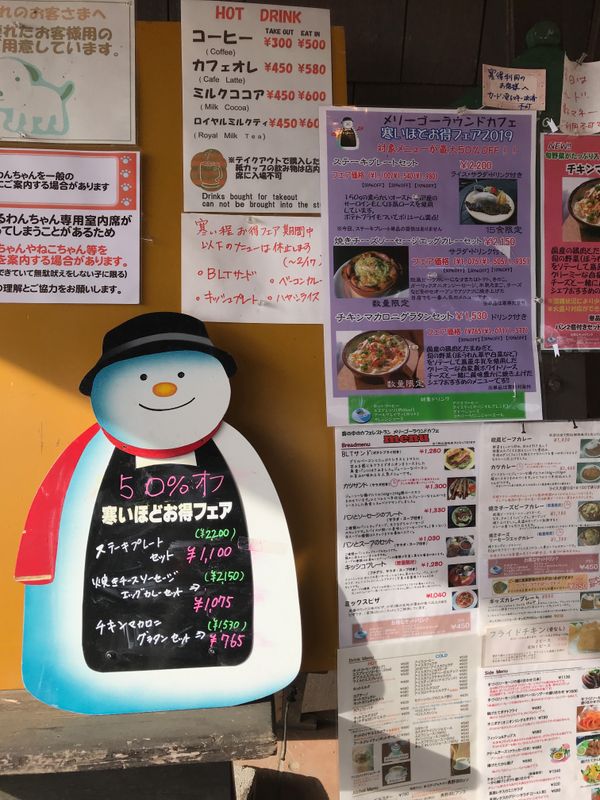 At Moegi-no-mura, one of the main attractions is the cute merry go round in the center of the village shops. Right in front of the merry go round, in plain sight, is the Merry Go Round Cafe. It's a pretty large establishment, despite the outward appearance, so there's plenty of seating. Originally, we stopped in because we were trying to find some 100% milk soft serve that the town is supposedly famous for. However, because it was still winter, the main soft serve places weren't open. Merry Go Round Cafe was advertising milk ice cream, but it turned out not to be soft serve so we passed on it. They did have a bunch of delicious-sounding flavors. Instead, we looked at a bunch of dog-themed (and a few cat-themed) goods that they had in the front of the shop. There were lots of stickers, figures, and stationary type things. They had almost every breed you can imagine (though a good number of them were sold out) so you can find something for almost every dog lover in your life. And if you have a dog yourself, you can find its twin. If you happen to have brought your canine companion around, there is terrace seating that is dog-friendly. So, both you and your furry friend can make a day of this, enjoying treats for both of you.